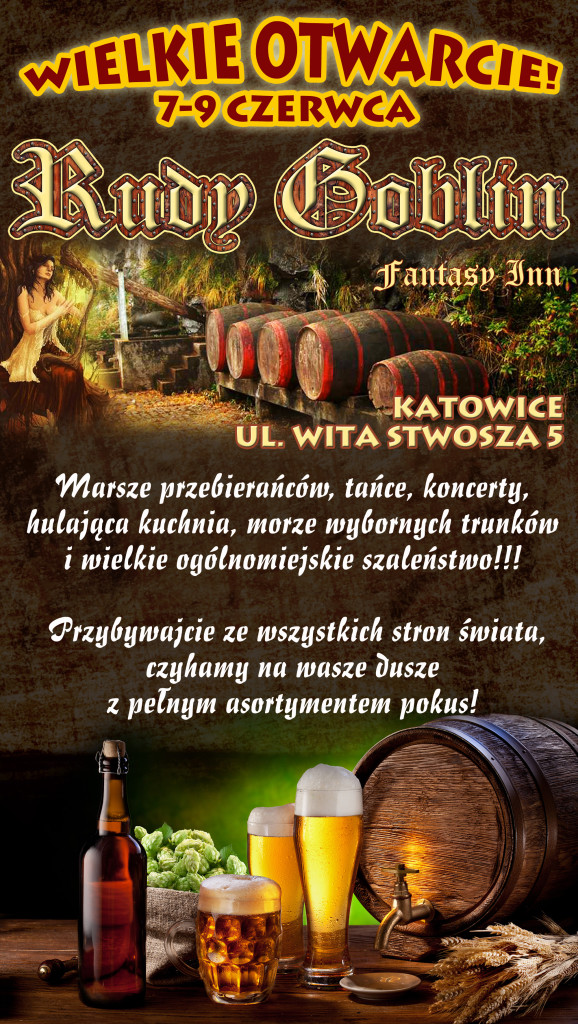 W dniach 7-9 czerwca odbędzie się wielkie otwarcie Rudego Goblina – jedynej w Polsce karczmy średniowiecznej – fantasy. Właściciele zapraszają wszystkich do Katowic na ulicę Wita Stwosza 5. W programie koncerty, marsze w strojach przez miasto, spotkania z pisarzami i wiele, wiele innych atrakcji. Nie ominie was również wielka degustacja z udziałem wszelkiego asortymentu trunków od piw rzadkich a niezwykłych przez hipokras średniowiecznej receptury, aż po takie cudeńka jak mocarna miodula staropolska. Na zakąskę będą potrawy „fantastycznej” kuchni, ze słynnym na konwentach kociołkiem krasnoludzkiej mamuśki na czele! Jeśli nie satysfakcjonuje was bierne uczestnictwo, właściciele zapraszają do współpracy, zarówno podczas samego otwarcia jak i po nim.